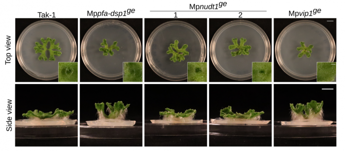 Genetic rescue experiments with vih1 vih2 plants revealed that the PPIP5K kinase but not the phosphatase activity is essential in Arabidopsis (Zhu et al., eLife, 2019). This could be in part explained by the presence of other PP-InsP phosphatases that may act redundantly with the PPIP5K phosphatase domains of VIH1 and VIH2. PhD student Florian Laurent characterized NUDIX and PFA-DSP hydrolases as PP-InsP phosphatases in vitro (Laurent et al., PLoS Genet, 2024). Over-expression of NUDIX or PFA-DSPs in Arabidopsis indeed alters cellular PP-InsP pools, but potentially due to genetic redundancy no convincing loss-of-function phenotypes could be obtained (Laurent et al., PLoS Genet, 2024). Since fewer family members exist for both NUDIX and PFA-DSP hydrolases in Marchantia polymorpha,